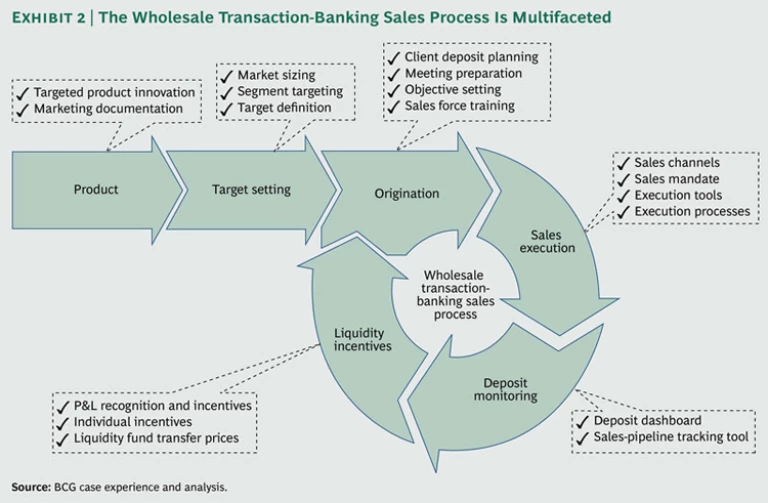 There is no silver bullet for excelling in sales. But the leading banks seem to be highly disciplined at aligning and executing all elements of the sales cycle, cutting across traditional silos. They focus efficiently and effectively on product development, target setting, origination, sales execution, deposit monitoring, and liquidity incentives. (See Exhibit 2.)
