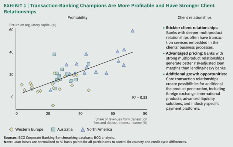 Banks that excel at wholesale transaction banking—institutions that we refer to as transaction-banking champions—have been able to gain a significant advantage over their peers in this environment. They generate higher profits, form deeper client relationships, leverage pricing to their advantage, and seize growth opportunities rapidly. (See Exhibit 1.) Most important, they have created a stable, reliable business.