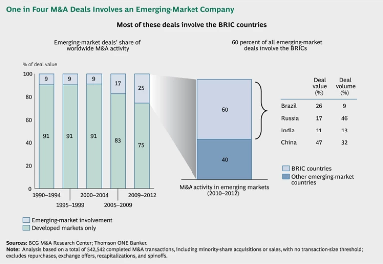 The emerging markets, especially the BRIC countries, stand out as a relative bright spot. Although emerging-market M&A values and volumes declined in 2012, deals involving emerging-market countries account for an increasing share of activity. One in four M&A transactions involves an emerging-market company as buyer or seller. Sixty percent of these deals involve a BRIC country.