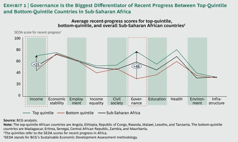 Second, when looking across the ten components of the measure, effective governance—even more than rising income—is the single largest differentiator between the Sub-Saharan African countries that improved their overall well-being scores the most and those that improved the least.