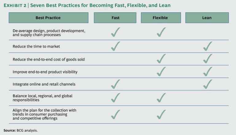 In work our throughout the industry, BCG has identified seven best practices that can enable apparel companies to make their supply chains faster, leaner, and more flexible. We explore each of the best practices in turn.