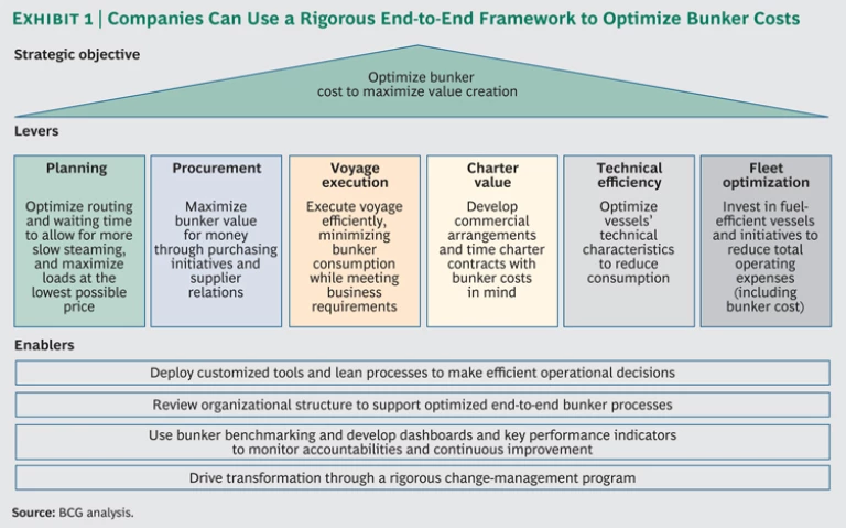 Shipping companies that want to reduce bunker costs should evaluate each step of their current bunker processes and determine which departments and functions are involved. They should look for clear communication of responsibilities and accountabilities, performance-monitoring mechanisms, and competitor benchmarking. An absence of any of those elements would indicate an opportunity for significant improvement. To create a distinctive source of competitive advantage, shipping companies should take action now.