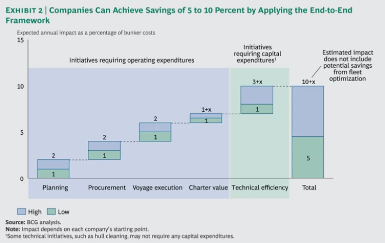 To help shipping companies address these challenges, BCG has developed an end-to-end framework for reducing bunker costs. The framework comprises ten elements—six levers and four enablers—each with distinct objectives. (See Exhibit 1.) Each company will need to select the levers that apply to its own particular situation. But all companies should apply all of the enablers to unleash the full potential of the identified initiatives. By following this framework, a company can realize annual savings of 5 to 10 percent. (See Exhibit 2.)
