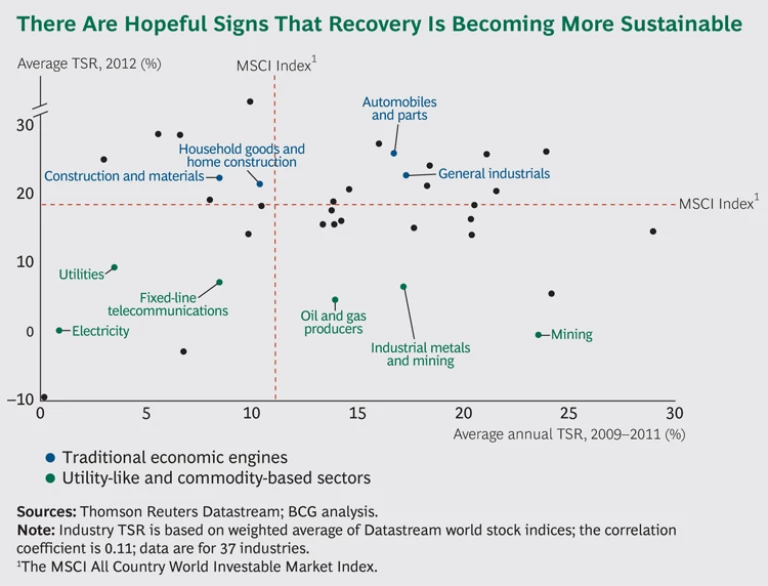 Many of the underperforming companies in 2012 hailed from sectors that experienced value-creation challenges in recent years, such as utilities, electricity, and fixed-line telecommunications, or from commodity-based sectors, including mining, oil and gas producers, and industrial metals and mining, that were unable to sustain their outsize returns.