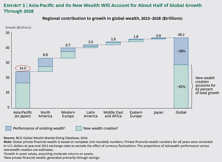 Looking ahead, global private wealth is projected to post a compound annual growth rate (CAGR) of 5.4 percent over the next five years to reach an estimated $198.2 trillion by the end of 2018. The Asia-Pacific region and its new wealth will account for about half of the total growth. (See Exhibit 3.) Continued strong GDP growth and high savings rates in RDEs will be key drivers of the rise in global wealth.