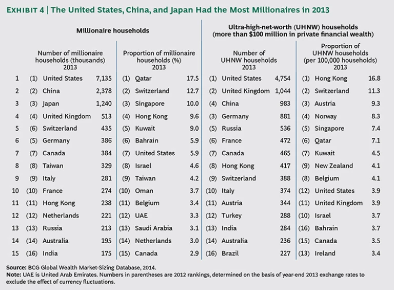 As the debate over the global polarization of wealth rages on, one thing is certain: more people are becoming wealthy. The total number of millionaire households (in U.S. dollar terms) reached 16.3 million in 2013, up strongly from 13.7 million in 2012 and representing 1.1 percent of all households globally. The U.S. had the highest number of millionaire households (7.1 million), as well as the highest number of new millionaires (1.1 million). (See Exhibit 4.) Robust wealth creation in China was reflected by its rise in millionaire households from 1.5 million in 2012 to 2.4 million in 2013, surpassing Japan. Indeed, the number of millionaire households in Japan fell from 1.5 million to 1.2 million, driven by the 15 percent fall in the yen against the dollar.