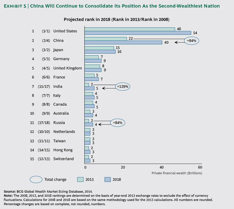 Strong equity markets helped countries in the old world, which have large existing asset bases, to match the rapid growth in assets in the new world, which relies more on new wealth creation spurred by GDP growth and high savings rates. For example, private wealth grew by double digits in the U.S. and Australia, while some emerging markets, such as Brazil, showed substantially weaker growth. China will continue to consolidate its position as the second-wealthiest nation, after the U.S. (See Exhibit 5.)