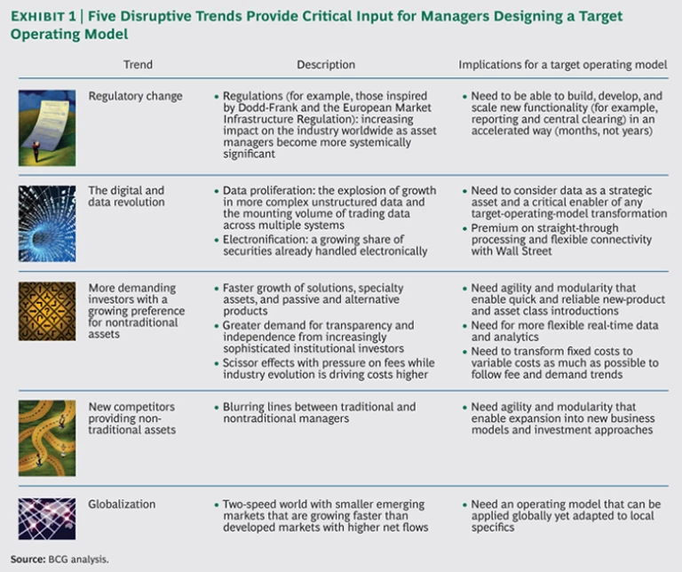 While the new new normal reshapes financial services, managers will find that the five disruptive trends introduced in Global Asset Management 2014: Steering the Course to Growth provide critical inputs as they define their target operating model. (See Exhibit 1.)