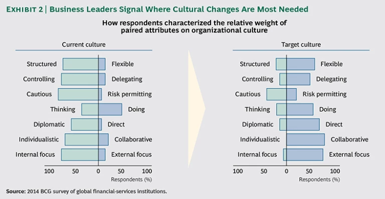 The problem is that while business leaders recognize the importance of culture change in propelling and sustaining high performance, BCG research shows that relatively few address it in the early stages of the transformation. Although the majority of respondents indicated that they believe culture change accounts for 20 percent of a transformation’s total value, only one-third of respondents factor it into their program and only one-quarter indicated that employee satisfaction and engagement were specific program objectives. Despite this paradox, participants broadly agree on the cultural characteristics most likely to yield a successful outcome—including a collaborative, flexible, customer-centric environment. (See Exhibit 2.)