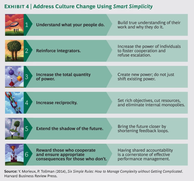 To help establish the organizational context for lean, companies can use BCG's Smart Simplicity rules: understand what your people do, reinforce integrators, increase the total quantity of power, increase reciprocity, extend the shadow of the future, and reward those who cooperate. (See Exhibit 4.)