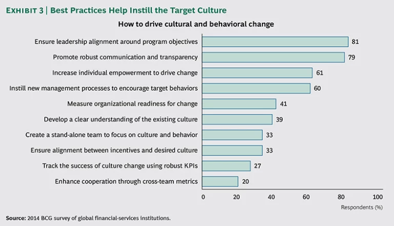 Neglecting the importance of culture change is a missed opportunity. BCG research shows that financial services companies that succeed in infusing a lean mind-set into the DNA of their organizations can deliver efficiencies and cost savings of more than 35 percent and improve customer service and cycle times by more than 50 percent.