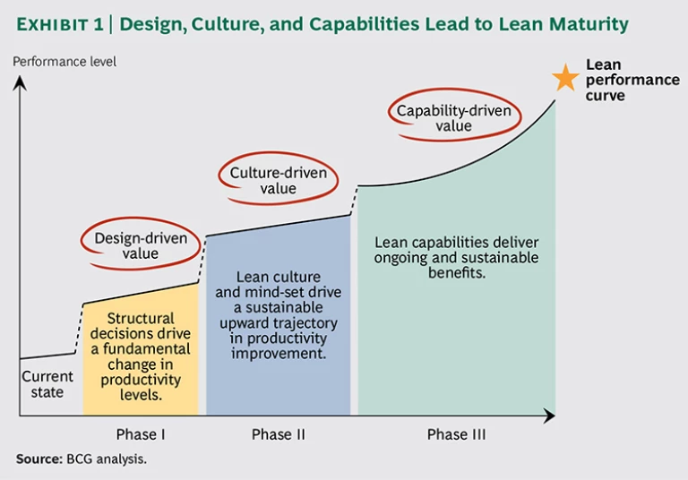 Institutions typically go through several phases of maturity with respect to their lean programs. Value is often initially driven by process redesign and coordinated by a centralized team. Ramping up from there, however, requires a high-performing culture that can expand the improvement mandate so that all employees feel part of the process and the changes become “business as usual.” When that happens, employees become more invested in the program and the skill base broadens across the company—qualities that embed organizational capabilities and help sustain lean gains long after the formal transformation effort concludes. (See Exhibit 1.)