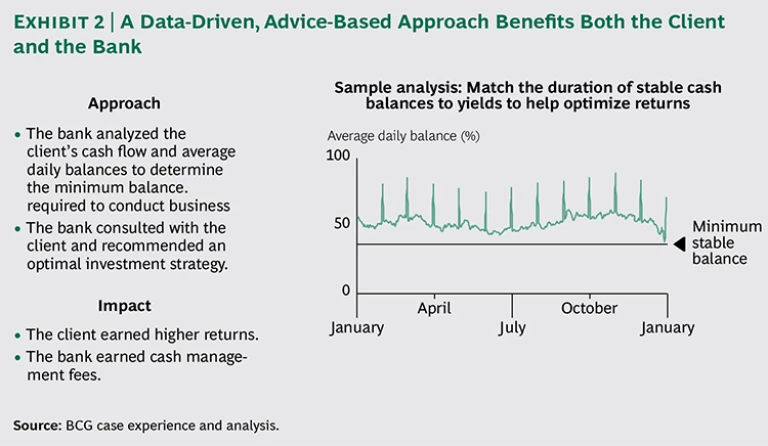 In one case we observed, for example, a wholesale-banking client was having problems determining how to invest its short-term cash. End-of-month balances routinely spiked, and the client ended up not investing fully one-third of its free cash. Using a data-driven, advice-based approach, the bank analyzed the client’s cash flow and average daily balances to determine the minimum amount required for conducting routine business. The bank also recommended an optimal investment strategy for the client. The result was a win-win situation in which the client earned higher returns and the bank earned higher fees by demonstrating the scope of its cash-management capabilities. (See Exhibit 2.)