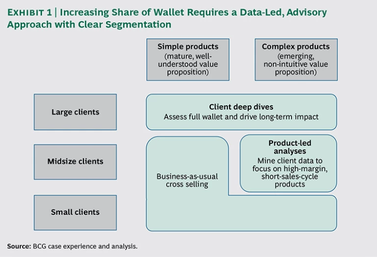 Indeed, banks typically do have direct access to the top decision makers and influencers at client companies. The key dilemma, however, is figuring out how best to approach these executives. Our experience working with wholesale banks shows that a data-led, advisory approach—tailored to different client segments and product types—can lead to meaningful engagement with existing clients that ultimately leads to a greater share of wallet. (See Exhibit 1.)