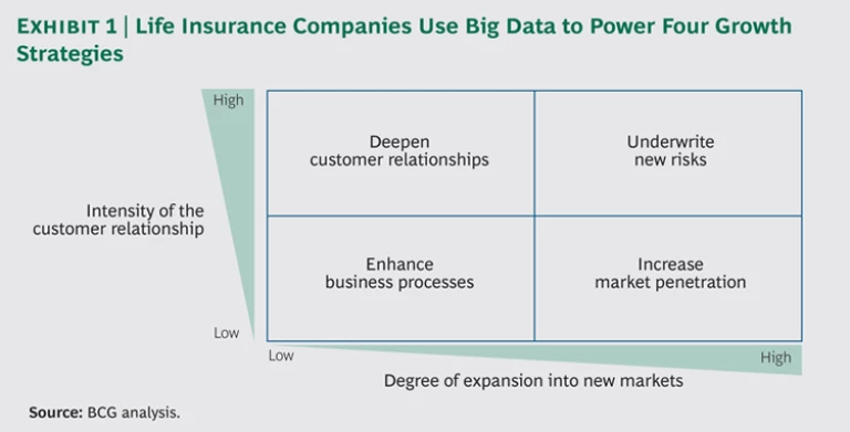Yet after conducting a comprehensive survey of the industry, we have found that forward-thinking life-insurance companies are overcoming these challenges through four growth strategies. Some are using big data and advanced analytics to improve business processes and expand into new markets, thereby generating significant revenues and profits. Others are building long-term, trusted relationships with customers. These insurers are offering valuable new or improved products and services in exchange for personal data that customers provide voluntarily. The new offerings may help clients improve their health or may provide access to insurance for people who are considered risky or expensive to serve.