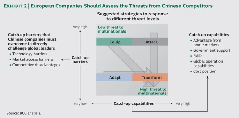 To respond effectively, European machinery manufacturers need to understand the specific threat Chinese competitors pose. We have constructed a “threat matrix” that classifies the intensity of Chinese competition in an industry or subsector. (For a general discussion of the matrix, see “The Next Wave of Chinese Cost Innovators,” BCG article, January 2013.) The matrix assesses the threat by considering the catch-up barriers (such as technology and market access) that Chinese companies must overcome to challenge global leaders directly, as well as their catch-up capabilities (such as R&D, cost position, and government support). On the basis of the threat classification, the assessment suggests four basic corresponding responses: equip, adapt, attack, and transform. (See Exhibit 2.)