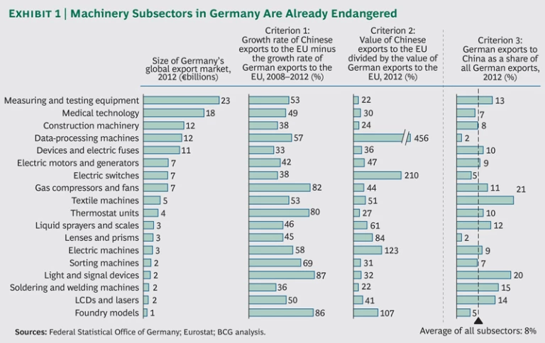 The first criterion is the difference between the growth rates of Chinese exports and European exports to the EU from 2008 through 2012. This figure is at least 80 percent for four subsectors—light and signal devices, foundry models, gas compressors and fans, and thermostat units—indicating that Chinese competitors are rapidly gaining ground on, if not overtaking, European manufacturers. The second is the relevance of Chinese exports in the subsector. Relevance is determined by dividing the value (in euros) of Chinese exports to the EU by the value of German exports to the region in 2012. Chinese exports have higher value in four subsectors—data-processing machines, electric switches, electric machines, and foundry models—meaning that Chinese attackers have already seized market leadership from German manufacturers.