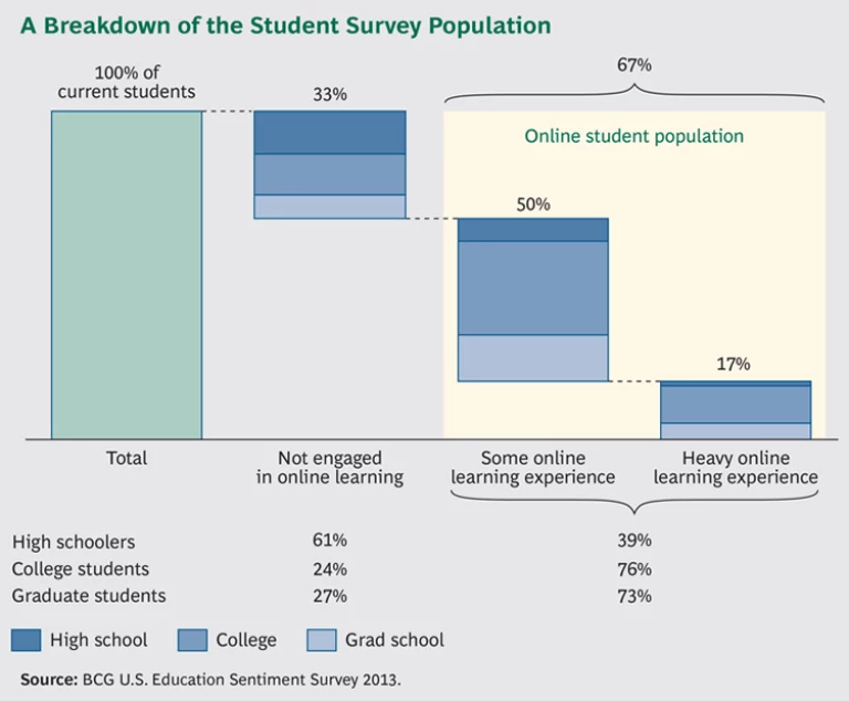 However, our research has also found that different groups of students have widely varying expectations of—and needs for—their future learning experience. These similarities and differences point to important lessons for leaders anticipating and shaping the future of online education. Institutions that fail to prepare for these shifts and respond to the dramatically increased competition among online offerings risk losing relevance and overall market share. Those that adapt will discover huge untapped opportunities for growth, new platforms for innovation, and the potential to transform how future generations of students learn.