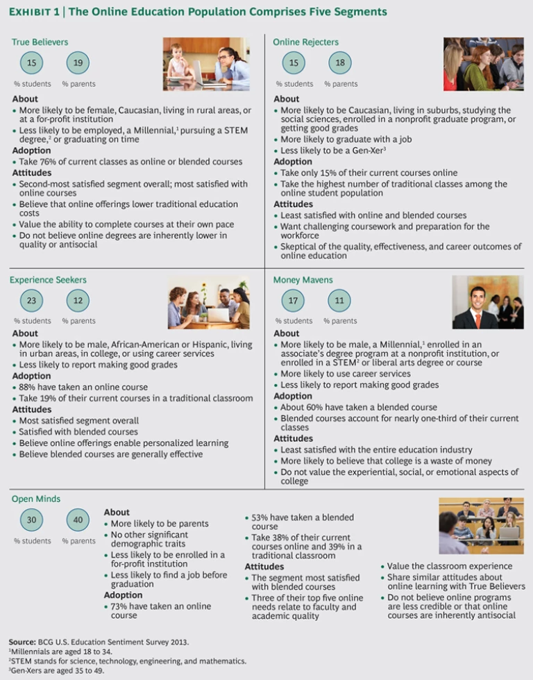 Despite shared attitudes and preferences in general, students and parents are by no means homogeneous. We have identified five distinct segments within the online education population: True Believers, Online Rejecters, Experience Seekers, Money Mavens, and Open Minds. (For snapshots of these five segments, see Exhibit 1.) Each displays important differences in educational experiences, age, behaviors, priorities, methods of engagement, and—to a lesser extent—demographics.