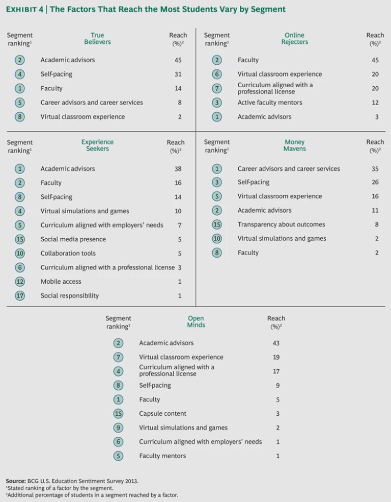 In addition to looking at unduplicated reach, institutions should also tailor their approaches to each student segment. We have found that the individual factors that increase consideration among members of a segment, and therefore that add new students, vary considerably. (See Exhibit 4.) Amid the reality of constrained re-sources, leaders must meet unique student needs and generate insights into which factors meaningfully increase reach among high-priority groups. Such tactics allow institutions to do more with less as they target individual student segments, deliver greater student satisfaction, and improve student outcomes. In addition, a segment-ed approach highlights ways that institutions may evolve in order to break out of the confines of historical perceptions and to attract entirely new types of students.