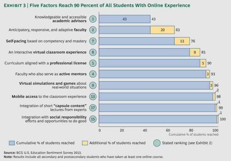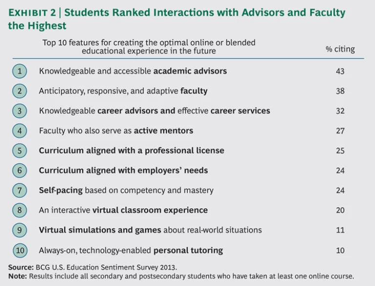 Consider, for example, the features that students stated explicitly were the most important in creating the optimal online or blended educational experience in the future. (See Exhibit 2.) When forced to rank future features that would most improve the educational experience, the students we surveyed prioritized knowledgeable and accessible academic advisors, responsive and adaptive faculty, knowledgeable career advisors and effective career services, and faculty who also serve as career mentors.