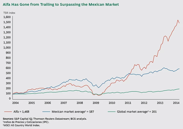 The Mexican conglomerate Alfa, with an average annual TSR of 68.9 percent from 2009 through 2013, is the top value creator among multibusiness companies in the 2014 BCG Value Creators report. Alfa's success in redirecting its TSR trajectory during this period is also a classic example of a TSR turnaround.