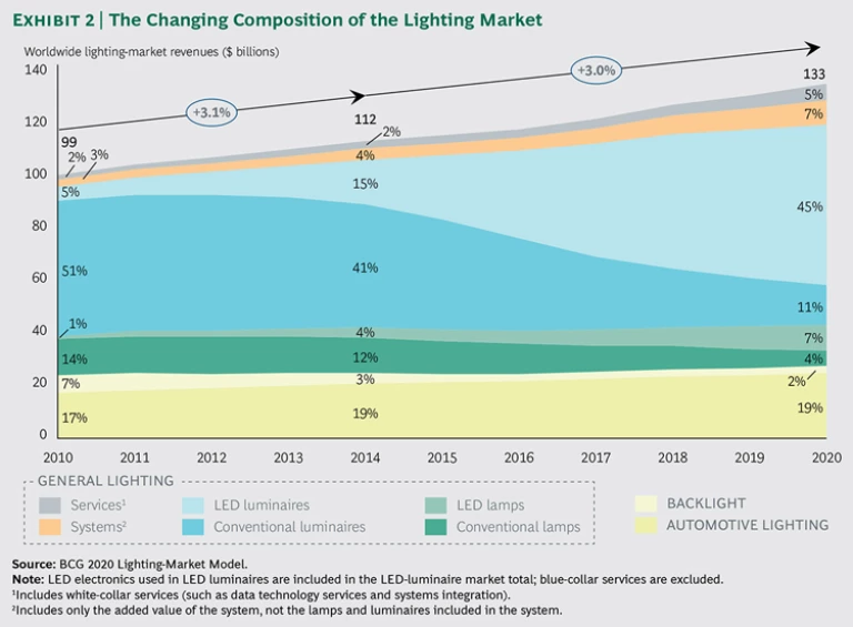 The increasing adoption of LED and connected lighting systems will fundamentally alter the composition of the global lighting market by 2020. (See Exhibit 2.) In the face of such a transformation, it is critical that companies rethink their strategies.