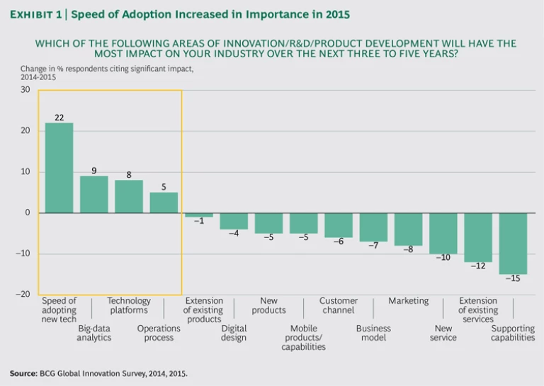 Size can give you scale, but for innovation, speed is more critical,” says Rakesh Kapoor, CEO of Reckitt Benckiser, the breakthrough-innovator consumer products company that we profiled in BCG's 2014 report on the state of innovation at companies worldwide. Speed has long been seen as an important attribute of strong innovators. The results of the survey underpinning this year's report, as well as our recent work with clients, indicate that its importance is rising fast. (See Exhibit 1.) Speed enables companies to catch consumer trends as they emerge, leave competitors flat-footed, and even drive costs down and quality up.