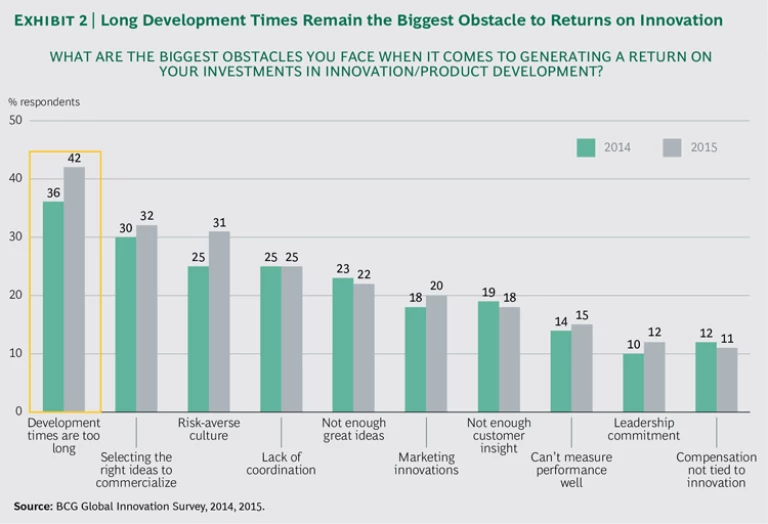 In our 2015 survey, overly long development times were the most-cited obstacle to generating returns on innovation and product development; 42% of global innovation executives said development times are too long—a 6 percentage point increase over 2014. (See Exhibit 2.) The same frustration is shared by strong, average, and weak innovators in roughly equal measure, but there the similarities end.