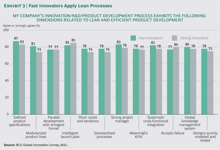 - Apply lean processes. The lean philosophy emphasizes speed as much as it does quality, efficiency, and elimination of waste. This year, for the first time, we asked our survey respondents to rate their companies’ innovation and product development activities on 12 dimensions related to lean and efficient product development, including short cycles and iterations, standardized processes, and the quick modeling and testing of designs. (See Exhibit 3.) When we segmented the responses by self-described strong and fast innovators, we found a close correlation between these two groups—and a high degree of employment by both of lean principles across all 12 dimensions. (Separate BCG research corroborates these results: the companies that deploy the principles of lean R&D reduce timelines by double-digit percentages, as well as increasing efficiency and overall value. For more on how they have achieved these results, see one of the companion articles in this series, “Strong Innovators Are Lean Innovators.”)