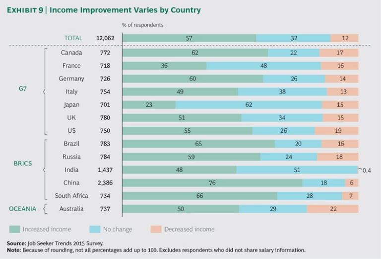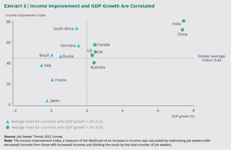 We expected that countries in good economic health (with GDP growth above 2%) would experience upward pressure on incomes in order to maintain hiring competitiveness. The survey results illustrated that the income improvement index was about 0.60 in those high-growth countries, compared with about 0.40 in countries with GDP growth lower than 2%. (See Exhibit 5 and Appendix, Exhibit 9.)