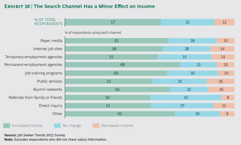 The choice of search channel did not have a big effect on income improvement. Strong income improvement was observed in channels used by a larger proportion of highly educated job seekers, such as permanent-employment agencies and alumni networks. Among the users of other popular channels—paper media, the Internet, and job training centers—roughly 60% experienced an income increase. About 50% of people who used the public, referral, and direct inquiry channels saw their incomes increase. (See Appendix, Exhibit 10.)