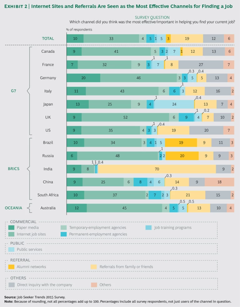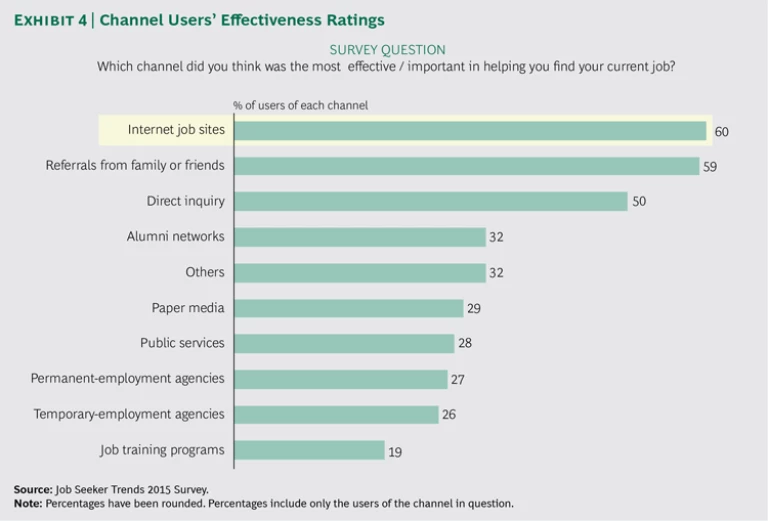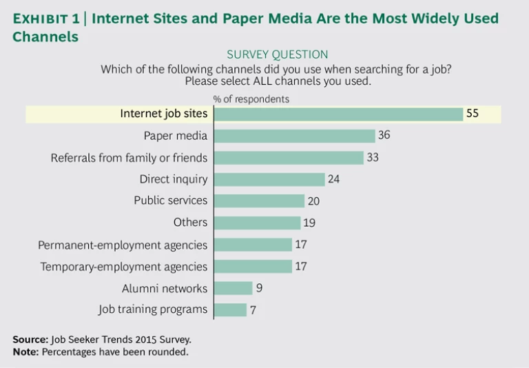 The Popularity of Internet Job Sites. Globally, Internet job sites were the most frequently used channel: 55% of all respondents had used such sites during their most recent search. In second place was paper media, used by 36% of job seekers, followed by referral and direct inquiry channels, through which 33% and 24%, respectively, searched for jobs. Twenty percent of respondents used public services. (See Exhibit 1.)