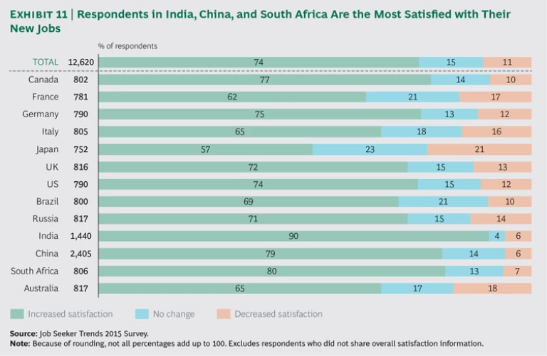 We asked job seekers if their new job was better, worse, or the same as their old one on each dimension. Seventy-four percent of respondents reported an overall improvement in job satisfaction. But overall satisfaction does not require improvement in all factors, nor is it caused by a single factor. Among satisfied respondents, only 41% experienced improvement in all four areas. Similarly, there was no single factor that improved for all satisfied respondents. Some 84% received an income increase, 77% saw an improvement in work content, 70% experienced better coworker relationships, and 76% found a better work environment. Overall satisfaction was highest among respondents in India, China, and South Africa. (See Exhibit 6, Appendix, Exhibit 11, and “Active Versus Passive Job Seekers.”)