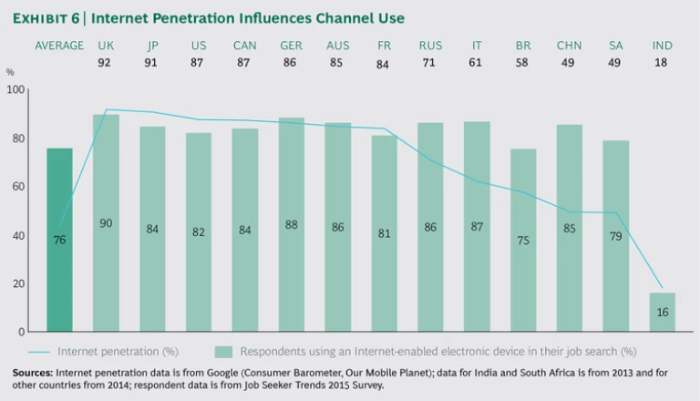 A Potential Surge in Searches from Mobile Devices. The Internet is the channel of choice for job seekers, especially the young, well-educated individuals most companies are eager to hire. But in many developing countries—in particular, those with low Internet penetration rates—smartphones and, increasingly, tablets are the most widely used devices for connecting with the Internet. Is your company recruiting in those regions, and, if so, has it tailored its user interface, messaging, and approach to smartphone and tablet users? Does it have the resources and infrastructure to handle large volumes of inquiries from mobile devices and to screen for the most desirable applicants? How does your company plan to attract visitors to its website and encourage an interactive flow of ideas—not just résumés?