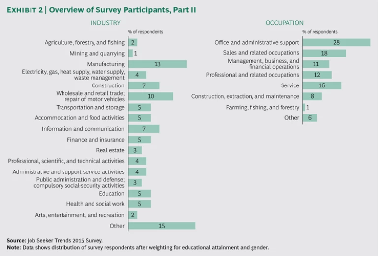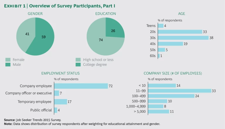 We surveyed more than 13,000 people from 13 countries on their 2014 job search experience and the outcomes of that process. The countries represented account for 59% of the roughly 3 billion people employed globally today. Respondents included approximately 820 people each from Australia, Brazil, Canada, France, Germany, Italy, Japan, Russia, South Africa, the UK, and the US; 1,600 from India; and 2,400 from China.