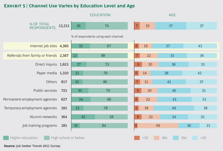 Different channels cater to different job seekers. In particular, the two most effective channels (Internet job sites and referrals) appealed to different demographics. The average Internet job site user was more educated and younger than the average job seeker. The average user of referrals was less educated and older. (See Appendix, Exhibit 5.)