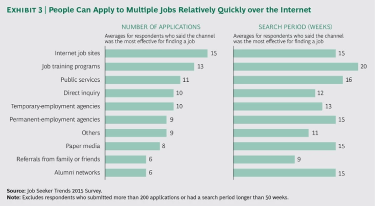 What makes Internet job sites such an attractive search option? They enabled survey respondents to apply for more jobs than any other channel. Furthermore, they allowed job seekers to apply to the highest number of jobs in the shortest amount of time. We believe that such ease and speed have increased the popularity of these sites. (See Exhibit 3.)