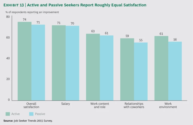 To account for such differences, we divided respondents into two categories. Active seekers were those who initiated the search. They looked for a new job, even if only casually, several times a week and reached out to their networks in search of referrals. Passive seekers were not actively looking for a job and were not dissatisfied with their current position, but they were willing to speak to a recruiter or to connections who sought them out.