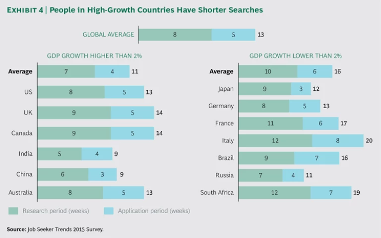 GDP Growth. During an economic boom, job creation is on the rise and demand for workers is high. As a result, offers tend to come more quickly. Job seekers in countries with GDP growth higher than 2% took an average of 11 weeks of search time, more than a month less than people in countries with GDP growth lower than 2%, who spent about 16 weeks on the process. Job seekers in high-growth countries saw a reduction of two to three weeks in the research period and in the application period. (See Exhibit 4.)