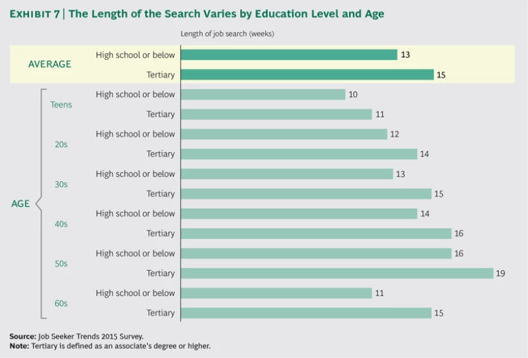 Education. The most highly educated job seekers in our sample consistently spent the most time searching, regardless of age. Respondents with tertiary-level qualifications (an associate’s degree or higher) tended to apply to more jobs and as a result spent more time on the search process—the research period, in particular. (See Appendix, Exhibit 7.)