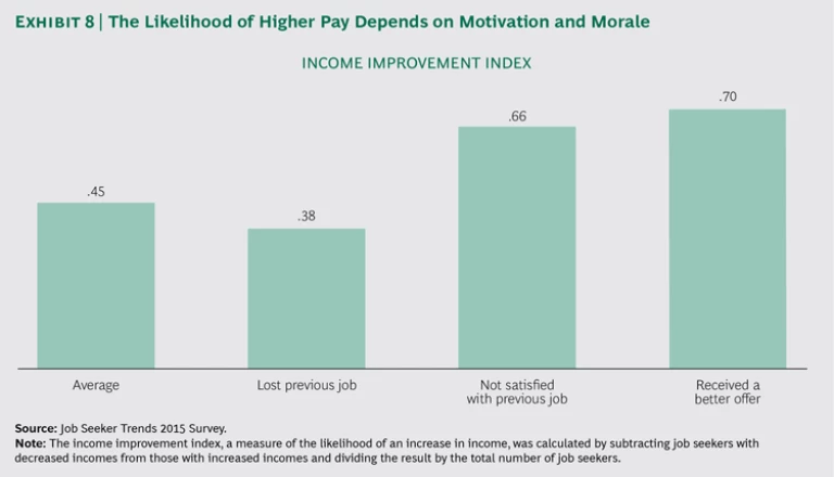 One reason why people look for new employment is to earn a higher income. But how often do employees achieve that goal? In our survey, we asked respondents if their incomes had increased, decreased, or stayed the same as a result of their job search. From their responses, we subtracted the number of people with decreased incomes from those with increased incomes and divided the result by the total number of respondents. The resulting income improvement index is an indicator of the likelihood of an increase in income. Our respondents’ average income improvement index was 0.45.