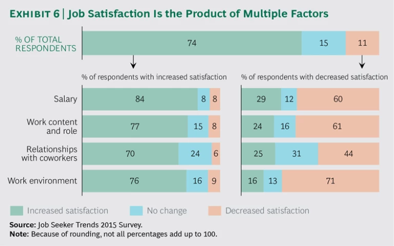Compensation and Other Components of Job Satisfaction. One reason for seeking new employment is higher pay. But survey respondents made it clear that good pay alone does not make a job satisfying. Improved roles and good colleagues are also important. Does your company have a strategy for delivering a satisfying work experience to demanding employees? Does its culture place a priority on creating a collaborative and supportive work environment, and do managers have well-designed incentives to make work satisfying for their direct reports? Is your company known for the quality of its work experience? If not, how do you plan to gain a reputation as an employer that not only pays well but also delivers job satisfaction in other ways?