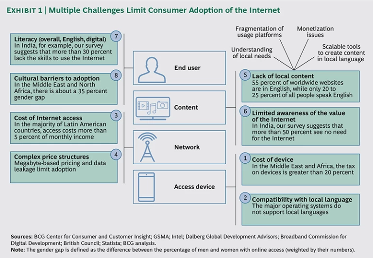 Encouraging Broader Internet Usage. Another critical challenge is to bring more people online, particularly in emerging markets. In many developed countries, there is a 30 to 50 percent difference between the number of people who have access to digital networks and the number who are actually online. In emerging markets, this gap jumps to 55 to 75 percent—and up to 90 percent in some cases. BCG’s research shows three main reasons for lack of adoption: perceived absence of need (resulting largely from lack of local-language content), followed by insufficient skills, with affordability as a distant third. Local content in local languages is vital for attracting local users and serving local needs. Governments also can help drive digital engagement with their own online services. (See Exhibit 1.)