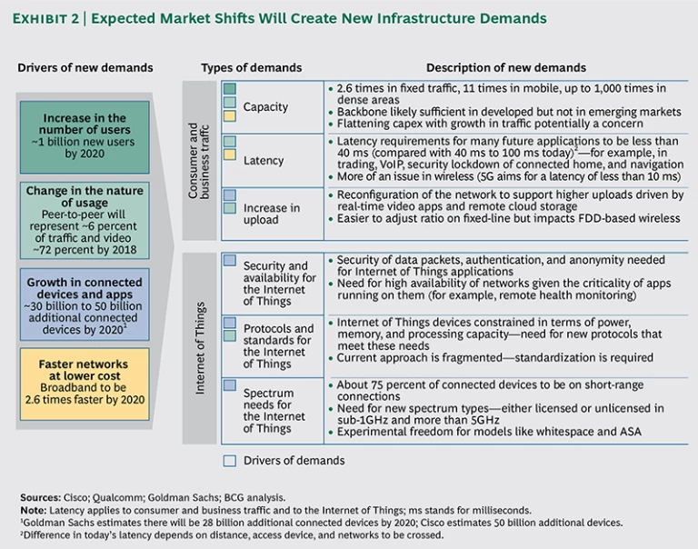 Shifting Infrastructure Demands. Yet another challenge is that, in both developed and emerging markets, the changing nature of consumer and business usage and the rise of the Internet of Things raise new infrastructure demands. (See Exhibit 2.) As mobile data usage matures, low latency and far more uploads raise new challenges for network infrastructure. Moreover, the addition of 30 billion to 50 billion or more connected “things” over the next five years—while representing an enormous opportunity for economic expansion and growth—further expands the network infrastructure challenge. Meeting this challenge presents some unique spectrum requirements, such as more data being uploaded and data with mission-critical requirements, and increases the need for standardized and secure communication protocols.