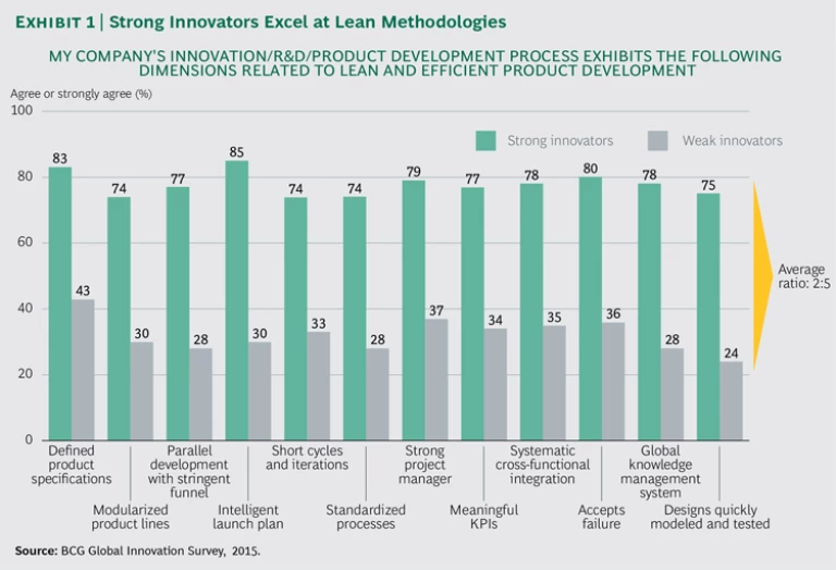 Yet the data is unequivocal—and compelling. In this year’s survey of the state of innovation at companies worldwide, we asked respondents for the first time to rate their companies’ innovation and product development activities on 12 dimensions related to lean and efficient product development, including short cycles and iterations, standardized processes, and the quick modeling and testing of designs. The overall responses were roughly 50% to 60% positive. But when we segmented them by strong versus weak innovators, the percentage of strong innovators following lean principles jumped to 74% or more—on every single dimension. Strong innovators are two to three times more likely to adhere to lean principles than their weak counterparts. (See Exhibit 1.)