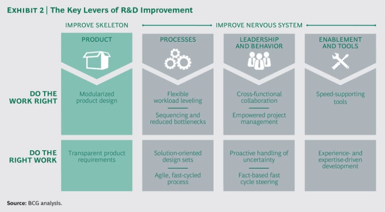 This isn’t to say that these companies focus solely on efficiency in the narrow sense of per unit cost. In R&D, being productive is as much about being smart about which bets to make—à la John Wanamaker—as it is about pursuing those bets efficiently. But the best companies put a process in place that enables good decision-making as well as good execution. (See The Lean Advantage in Engineering, BCG Focus, April 2015.)