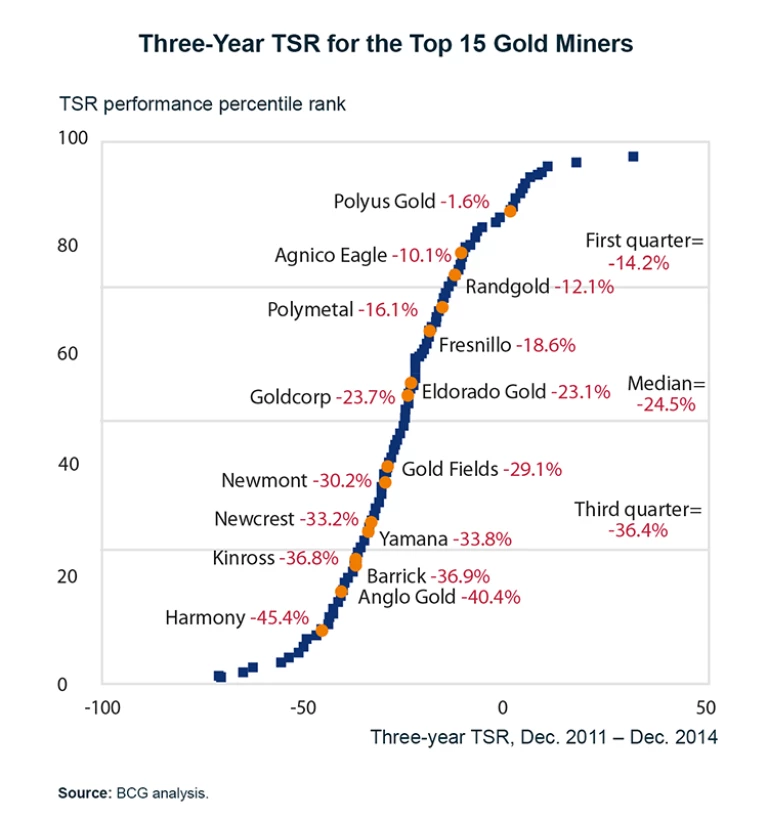 Our recent analysis of TSR for 15 major gold producers between December 2011 and December 2014 suggests that adopting these practices pays big dividends. (See Exhibit 2.) The top three performers in our analysis are Polyus, Agnico-Eagle, and Randgold. With the exception of Polyus, they’ve still delivered negative shareholder return in this difficult trading environment. But they’ve outperformed the rest of the industry in TSR in part because they have crafted, executed, and communicated a differentiated strategy that leveraged their intrinsic competitive strengths.