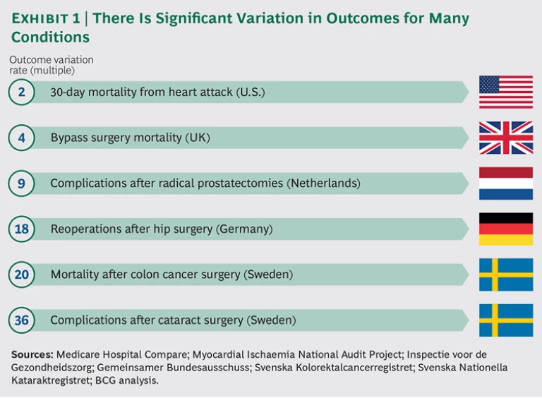 That same disparity is seen for other medical conditions and in other markets. (See Exhibit 1.) In the Netherlands, whose health care consistently ranks among the best in Europe, there is a ninefold variation in the rate of post-surgical complications from radical prostate surgery, a procedure that can have a major impact on a patient’s quality of life. In Sweden, the complication rate for some patients who undergo cataract surgery can be 36 times that of other patients. These variations are mainly the results of differences in medical practices—rather than demographics or other complicating medical conditions in patients—and can, therefore, be addressed.