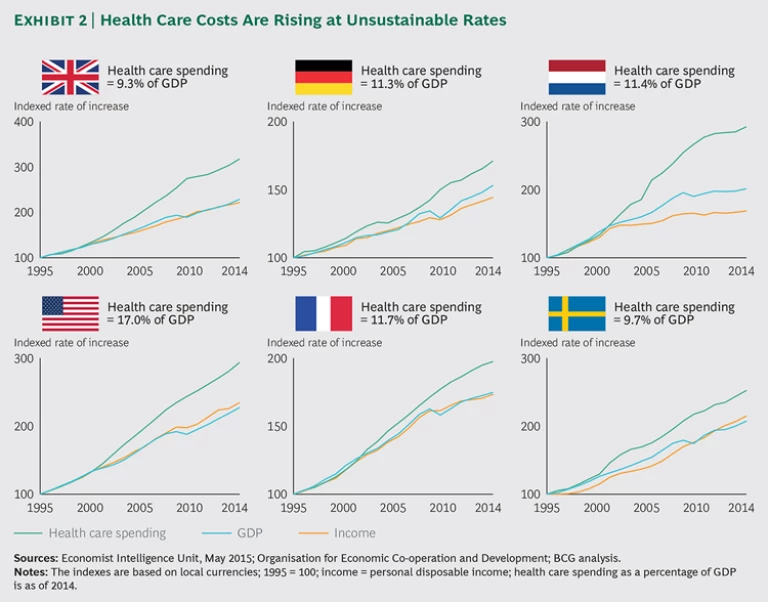 The second major health-care problem is spiraling costs. In the Netherlands, for example, health care spending rose seven times faster than GDP from 2004 through 2014. Most developed countries are experiencing similar increases in spending—rates that are simply unsustainable. (See Exhibit 2.) Given these two challenges—variations in outcomes and spiraling costs—there is an urgent need to find new ways to create value in health care.
